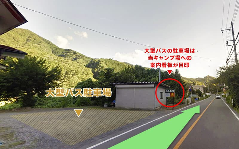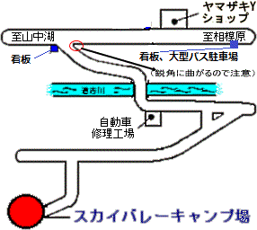 国道413号沿いの"スカイバレーキャンプ場200m先左折"の看板がある場所が当キャンプ場の大型バス駐車場になります。津久井方面からお越しの場合はヤマザキYショップの少し手前、山中湖方面からお越しの場合はヤマザキYショップを過ぎてすぐになります。