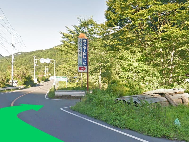 国道413号に設置されているセンタービレッジキャンプ場の看板のところで曲がります。