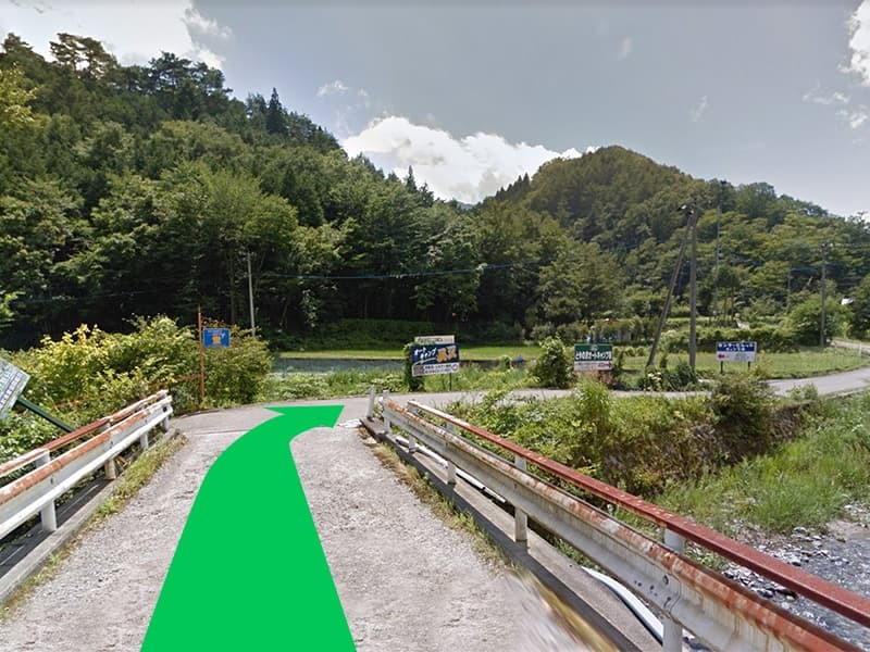 道なりに進んでいくと右手側に橋と自動車修理工場が見えてきますので橋を渡り、さらに道なりに進んでいきます。