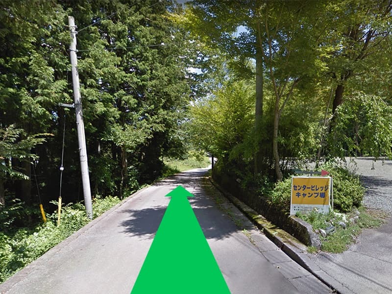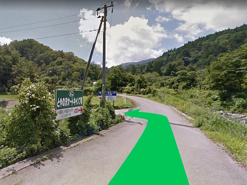 Y字路に当キャンプ場の看板がございますので右方向に進みます。