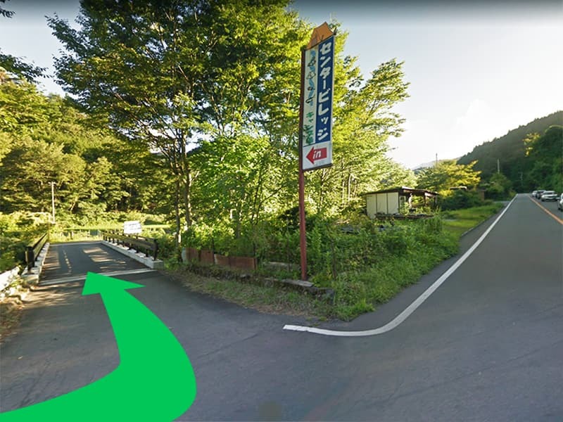 国道413号に設置されているセンタービレッジキャンプ場の看板のところで曲がります。