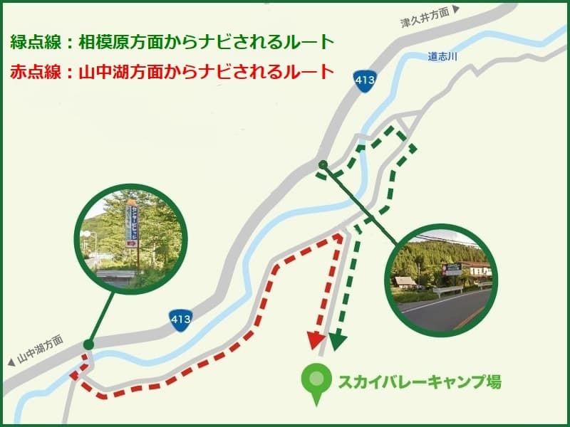 国道413号沿いの"スカイバレーキャンプ場200m先左折"の看板がある場所が当キャンプ場の大型バス駐車場になります。津久井方面からお越しの場合はヤマザキYショップの少し手前、山中湖方面からお越しの場合はヤマザキYショップを過ぎてすぐになります。
